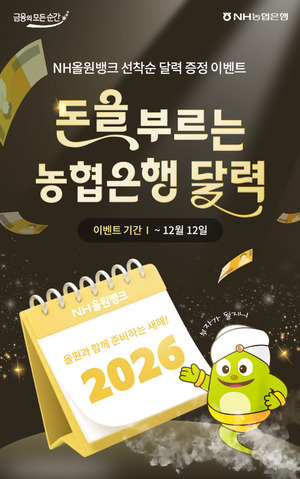 NH농협은행이 연말을 맞아 고객 성원에 보답하고자 12월 12일까지 ‘2026년 농협은행 달력 증정 이벤트’를 진행한다.고객은 NH올원뱅크 이벤트 페이지에서 세 가지 디자인 중 원하는 달력을 선택해 신청할 수 있으며, 총 2만5천 명에게 선착순으로 제공된다. 신청한 달력은 고객이 입력한 주소로 무료 배송된다.농협은행 관계자는 “새해의 풍요와 행운을 기원하는 마음을 담아 달력 증정 이벤트를 준비했다”며, “NH올원뱅크의 다양한 금융 서비스와 함께 뜻깊은 2026년을 맞이하시길 바란다”고 말했다.