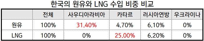 이와 같이 수입중량 기준 러시아는 한국의 원유 수입국 중 5위를 차지하고 있으며 LNG 수입국 중에서는 6위를 차지할 정도로, 한국의 러시아 에너지에 대한 의존도를 무시하기 어렵다는 평가다.