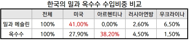 관세청 자료에 의할 때 2021년 기준 한국의 러시아산 밀과 메슬린 수입중량은 약 11만 톤이며 수입비중은 2.6% 수준이고, 같은 기간 우크라이나산 밀과 메슬린 수입중량은 약 29만 톤이며 수입비중은 6.5%로 파악된다.