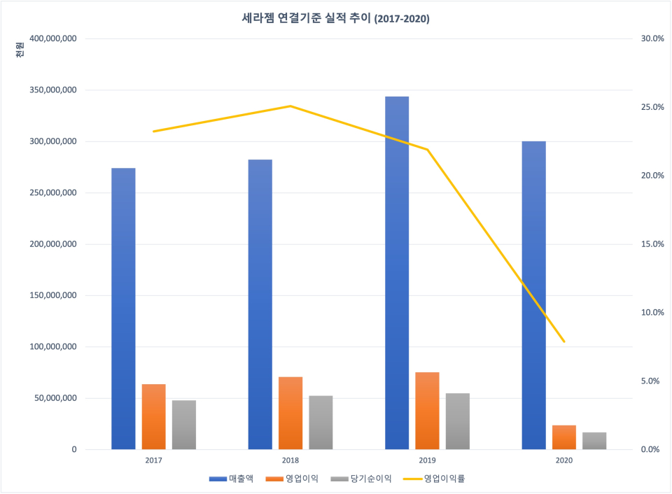 세라젬 연결기준 실적은 2018년까지만 해도 기대감이 충분히 형성될 정도로 성과가 긍정적으로 흘러갔다. 2018년 매출액 2824억원, 영업이익 708억원으로 영업이익률이 25.1%까지 치솟았다. 하지만 이듬해 매출 규모가 3481억원으로 1년 전보다 21.7% 증가했지만 영업이익은 6.3%만 증가해 그 속도를 따라가지 못해 영업이익률 21.9%로 낮아졌다. 2020년 들어 매출액, 영업이익 및 순이익이 일제히 하락했다. 3003억원의 매출액에 영업이익 237억원으로 영업이익률은 무려 전년 대비 14% 포인트 빠진 7.9%로 그야말로 주저앉았다.