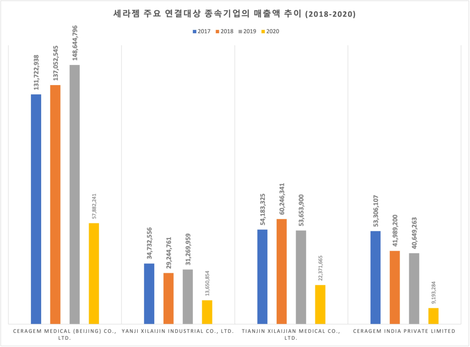 주요 연결대상 종속기업인 해외법인에서의 실적 악화가 문제였다. 감사보고서에 기재된 주요 연결대상 종속기업은 베이징, 텐진, 옌지 세 곳의 중국 법인과 인도 법인이다. 네 곳 모두 개인용 의료기 판매업을 하고 있으며 2019년까지 텐진과 인도 법인을 제외한 나머지 두 곳에서의 매출 사정은 지속적으로 상승하고 있었다. 하지만 이 성장세도 2020년 멈추다 못해 급격히 하락했다. 베이징 법인은 매출액이 2019년 대비 무려 61.1%나 줄어든 579억원에 그쳤다. 옌지, 텐진 법인의 매출도 마찬가지로 동기간 56.3%, 58.3%씩 줄어들었다. 인도 법인의 매출 감소세가 가장 심각했다. 2019년 406억원에서 2020년 92억원으로 77.4%나 감소했다.