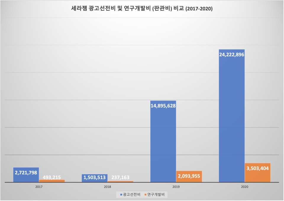 제품 판매를 위한 광고 선전 등에 투자하는 것은 마땅한 일이다. 그러나 의료용 기기 제조업인 세라젬은 제품 기능을 향상하기 위한 연구 개발보다 광고로 승부수를 띄우고 있다. 2017년 연구개발비로 5억원을 썼으나 광고 선전에는 이보다 약 5.5배 이상에 달하는 27억원을 썼다.