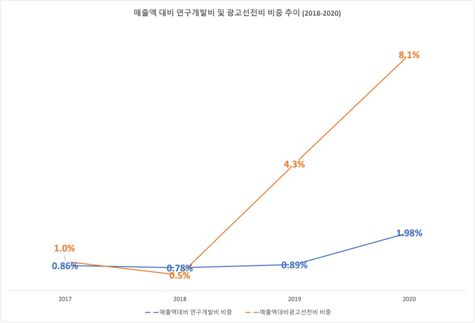 2019년에는 무려 149억원이 광고비로 사용된 반면 연구 개발비로는 21억원만을 투자했다. 광고비가 돌연 대폭 늘어난 이유는 유명 스타인 배우 이정재 씨를 전속 모델로 기용한 탓인 것으로 추측된다. 2020년에도 여러 명의 배우를 광고 모델로 내세우며 광고비로 242억원 이상이 지출됐다. 반면 연구개발비로는 약 7배 적은 35억원이 사용됐다.