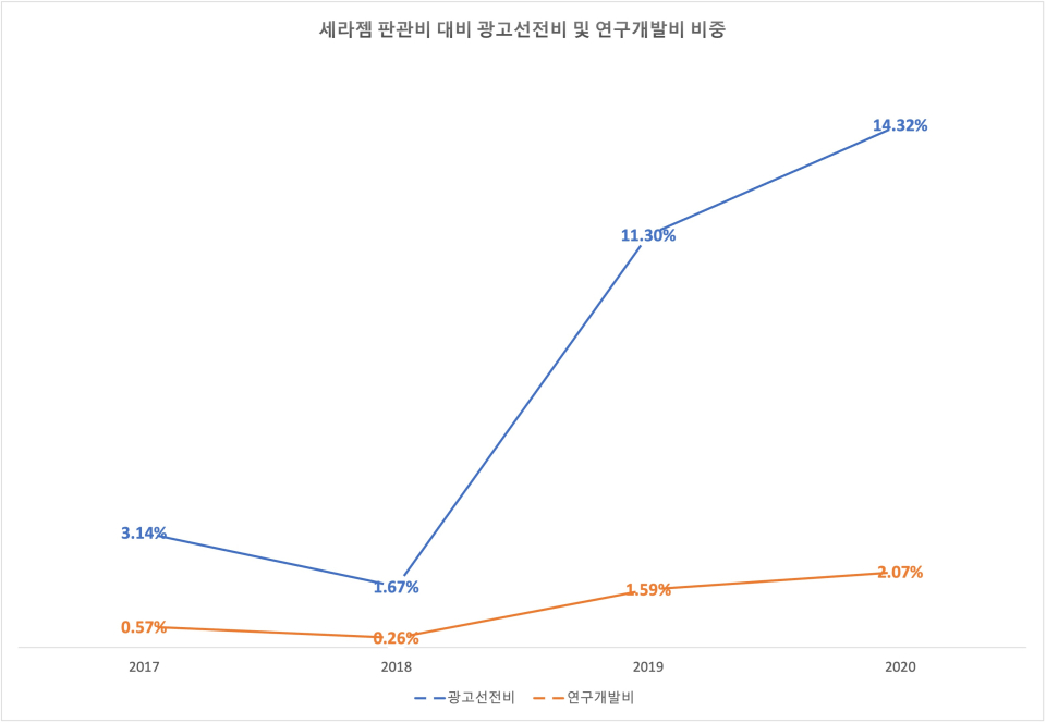 앞서 살펴본 대로 세라젬의 영업이익률은 2018년부터 계속 떨어지는 중이다. 영업이익을 갉아먹는 판매비와관리비(이하 판관비)가 그 요인으로 작용했다. 판관비 중 광고비가 차지하는 비중이 2018년 1.67%에서 2019년, 2020년 각각 11.3%, 14.32%로 늘어났고 이 탓에 판관비 총액이 크게 상승하며 이는 곧 영업이익률 저하라는 결과를 초래했다.