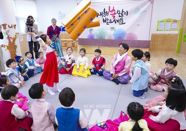 강기정 광주광역시장이 설 명절을 앞두고 8일 오전 시청어린이집을 방문해 원생들과 세배와 윷놀이를 하며 즐거운 시간을 보내고 있다./광주광역시 제공