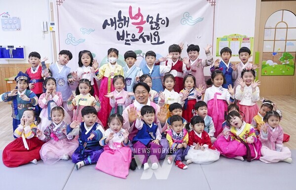 강기정 광주광역시장이 설 명절을 앞두고 8일 오전 시청어린이집을 방문해 원생들과 세배와 윷놀이를 하며 즐거운 시간을 보낸 뒤 기념촬영을 하고 있다./광주광역시 제공