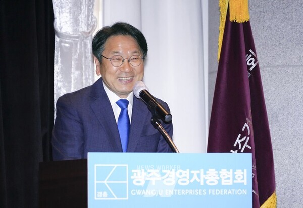 강기정 광주광역시장이 8일 오전 서구 홀리데이인 광주호텔에서 열린 광주경영자총협회 제44회 정기총회에 참석해 인사말을 하고 있다./광주광역시 제공