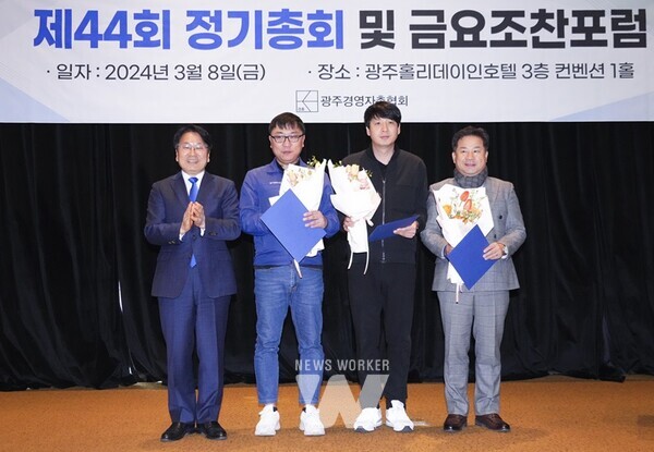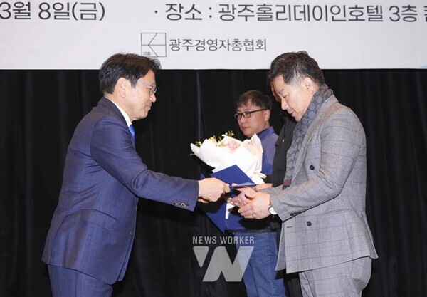 강기정 광주광역시장이 8일 오전 서구 홀리데이인 광주호텔에서 열린 광주경영자총협회 제44회 정기총회에 참석해 유공자 표창을 하고 있다./광주광역시 제공