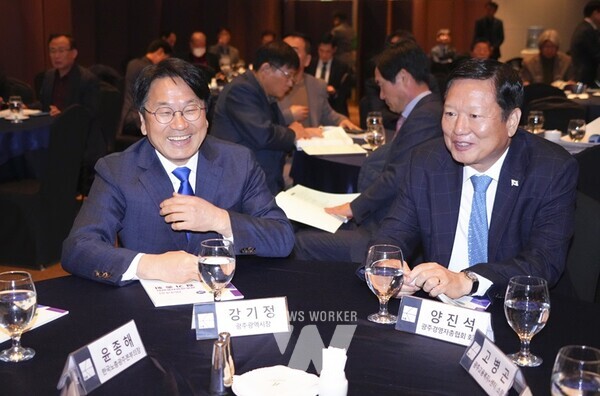 강기정 광주광역시장이 8일 오전 서구 홀리데이인 광주호텔에서 열린 광주경영자총협회 제44회 정기총회에 참석해 양진석 광주경영자총협회장과 대화를 나누고 있다./광주광역시 제공