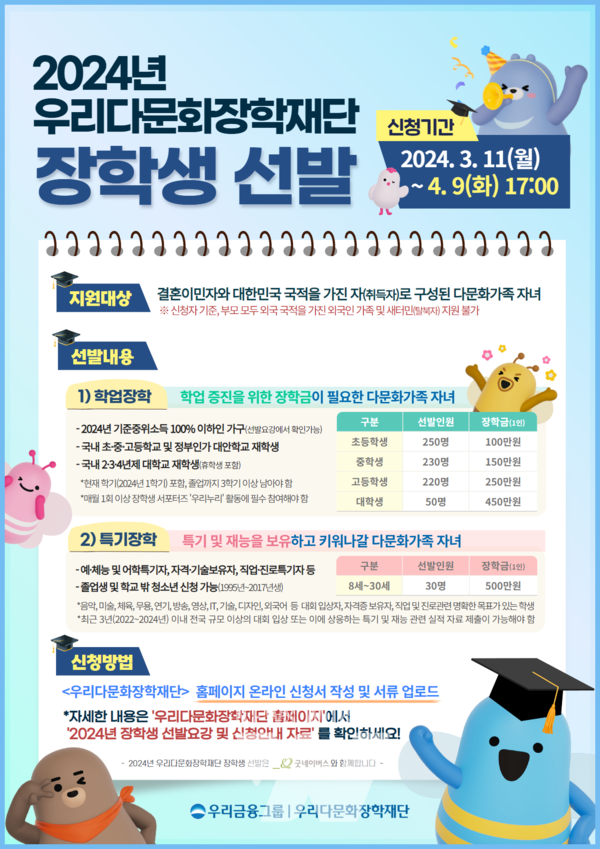 우리금융그룹 우리다문화장학재단이 2024년 다문화 장학생을 모집한다. 우리다문화장학재단은 다문화가족의 한국사회 정착을 지원하기 위해 금설립된 다문화가족 전문 지원재단이다. 특히, 올해부터는 장학금 지원 대상을 600명에서 800명으로 늘렸다. 또한, 미등록 이주아동과 부모를 따라 본국으로 돌아간 귀환가정 자녀 등 사각지대에 놓인 다문화가족 자녀들도 장학금 수혜 대상으로 포함했다.
