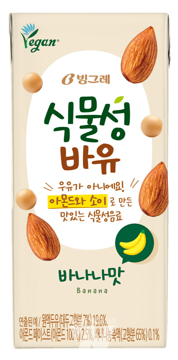 리뉴얼된 패키지 디자인은 곡물을 연상케 하는 베이지색 배경에 식물성 바유의 원물인 아몬드와 소이의 이미지를 삽입해 가시성을 높였다. 제품 용기 겉면에 ‘우유가 아니에요!’라는 문구를 표기해 식물성 음료임을 강조했다. 제품성분에 변화를 준 점도 특징이다. 기존 제품 대비 칼로리를 낮춤과 동시에 당 함량을 3분의 1 수준인 5g으로 저감했다. 담백함과 건강함뿐만 아니라 체계적인 제품 설계를 통해 맛있는 바나나맛을 구현했다.