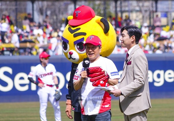 강기정 광주광역시장이 23일 오후 광주기아챔피언스필드에서 열린 KIA타이거즈와 키움히어로즈의 홈 개막전 경기 시구에 앞서 홈팬들에게 손을 흔들고 있다.