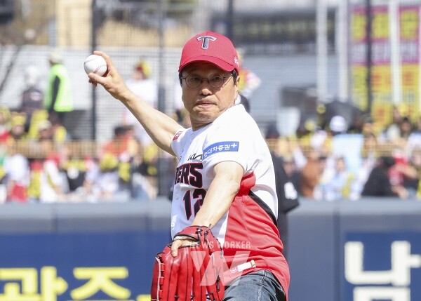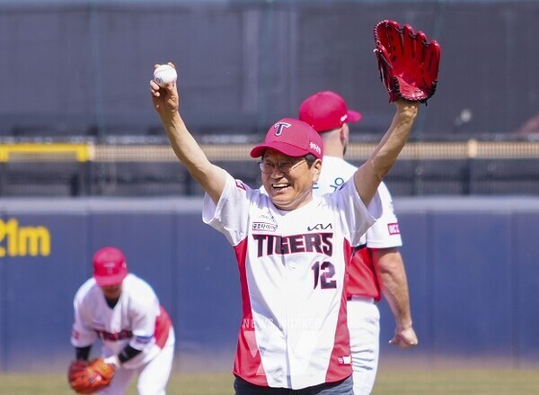강기정 광주광역시장이 23일 오후 광주기아챔피언스필드에서 열린 KIA타이거즈와 키움히어로즈의 홈 개막전 경기에서 힘차게 시구를 하고 있다.