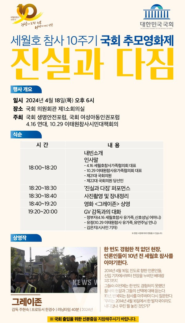 이번 국회 추모영화제는 세월호 참사 이후 10년을 함께 되돌아보기 위한 추모 행사로 국회 생명안전포럼, 국회 여성아동인권포럼, 4.16 연대, 10.29 이태원참사시민대책회의가 공동으로 주최한다.