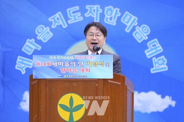 강기정 광주광역시장이 24일 오전 광산구 쌍암공원에서 열린 ‘제14회 새마을의 날 기념식’에 참석해 축사를 하고 있다./광주광역시 제공