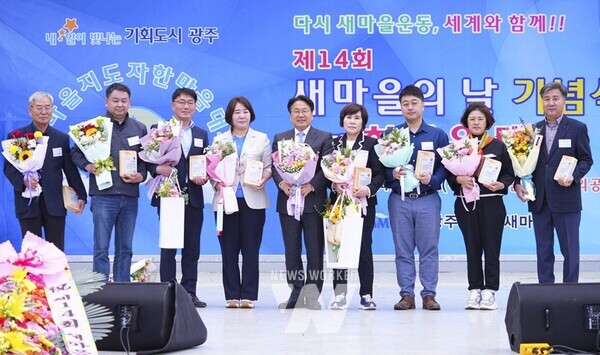 강기정 광주광역시장이 24일 오전 광산구 쌍암공원에서 열린 ‘제14회 새마을의 날 기념식’에 참석해 유공자 표창을 한 뒤 기념촬영을 하고 있다./광주광역시 제공