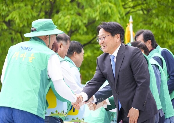 강기정 광주광역시장이 24일 오전 광산구 쌍암공원에서 열린 ‘제14회 새마을의 날 기념식’에 참석해 새마을 회원들과 인사를 나누고 있다./광주광역시 제공