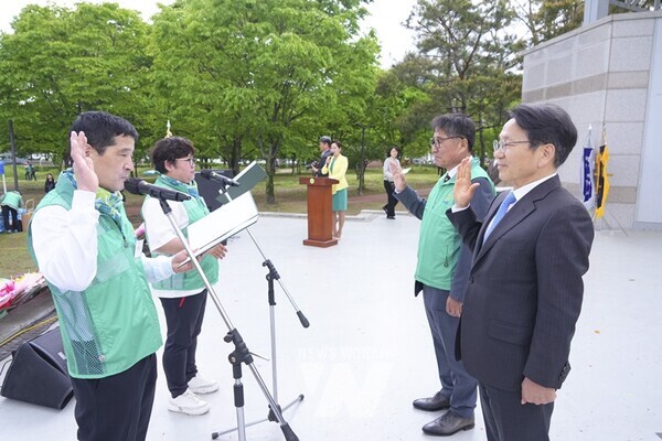 강기정 광주광역시장이 24일 오전 광산구 쌍암공원에서 열린 ‘제14회 새마을의 날 기념식’에 참석해 새마을지도자 결의문 낭독을 받고 있다./광주광역시 제공