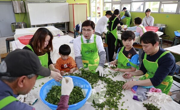 6일 제47회 보성다향대축제가 한국차문화공원 일원에서 개막한 가운데 김철우 보성군수가 관광객들과 함께 찻잎을 덖고 비비는 차 만들기 체험을 하고 있다.