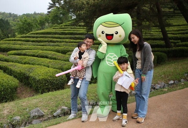 6일 제47회 보성다향대축제가 한국차문화공원 일원에서 개막한 가운데 축제장을 방문한 관광객들이 ‘보성군 SNS 캐릭터 녹차몬’과 함께 기념 촬영을 하고 있다.