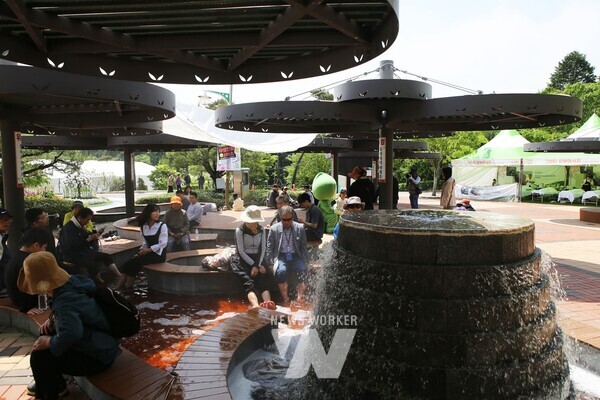 제47회 보성다향대축제가 한국차문화공원 일원에서 개막한 가운데 관광객들이 녹차물에 발을 담그는 족욕 체험을 하며 축제를 즐기고 있다.