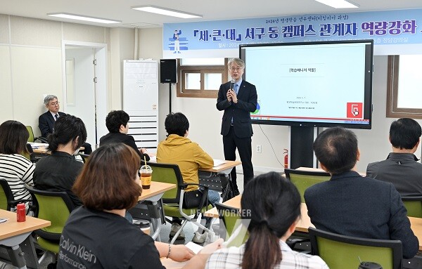 광주시 서구(구청장 김이강)는 7일 오전 평생학습관에서 세·큰·대(세상에서 가장 큰 대학, 서구) 18개 동 캠퍼스 매니저 및 대표자를 대상으로 평생학습문화연구소 대표 어재영 강사를 초청해 역량강화 교육을 실시했다.