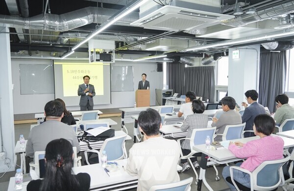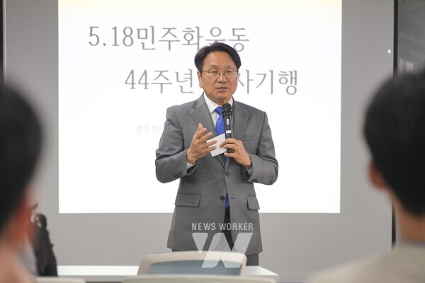 강기정 광주광역시장이 9일 오후 동구 전일빌딩245 중회의실에서 광주전남기자협회가 마련한 ‘전국 기자 초청 5·18 역사기행’에 참석해 인사말을 하고 있다./광주광역시 제공