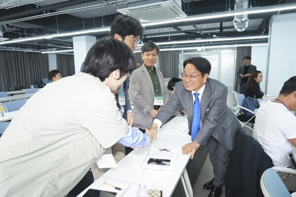 강기정 광주광역시장이 9일 오후 동구 전일빌딩245 중회의실에서 광주전남기자협회가 마련한 ‘전국 기자 초청 5·18 역사기행’에 참석해 기자들과 인사를 나누고 있다./광주광역시 제공