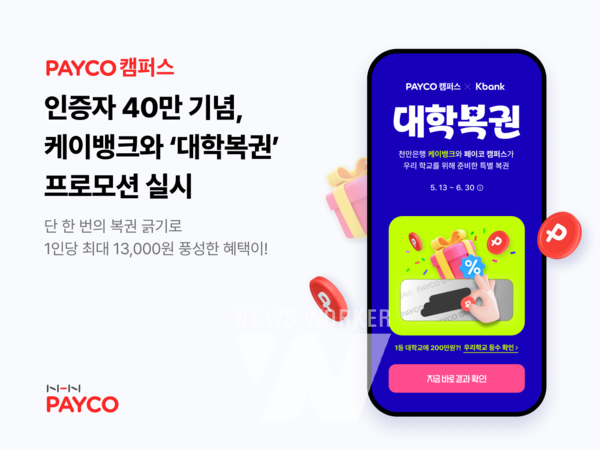 엔에이치엔 페이코(NHN PAYCO, 대표 정연훈, 이하 NHN 페이코)가 페이코 캠퍼스 누적 인증자 40만 명 달성을 기념해 케이뱅크와 함께 인당 최대 1만 3,000포인트를 제공하는 ‘대학복권’ 프로모션을 선보인다.