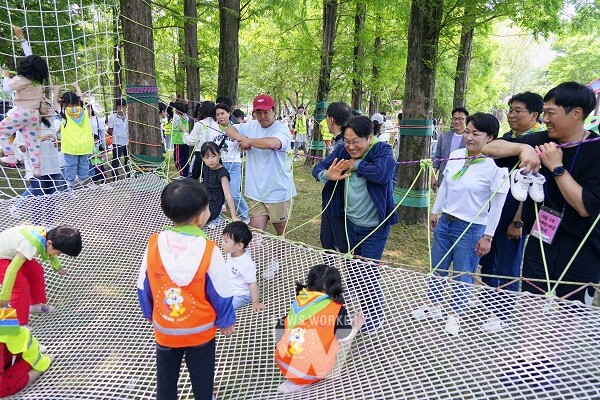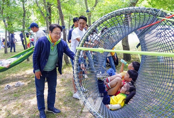 강기정 광주광역시장이 25일 오후 북구 광주시민의 숲 일원에서 광주시숲유치원협회가 마련한 '2024 가족과 함께하는 숲애(愛) ON-DAY' 행사에 참석해 밧줄놀이 중인 어린이들과 즐거운 시간을 보내고 있다./광주광역시 제공