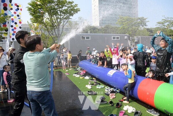 강기정 광주광역시장이 25일 제59회 광주시민의 날을 맞아 시청 앞에 설치된 '워터월드'에서 시원한 물줄기를 뿌리자 어린이들이 환호하고 있다. /광주광역시 제공