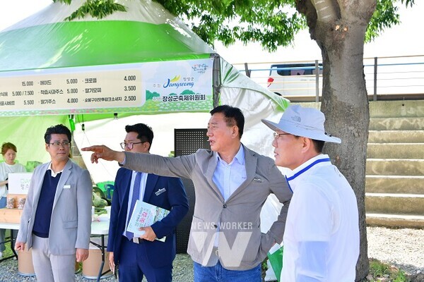 김한종 장성군수가 장성 황룡강 길동무 꽃길축제 첫날인 24일 축제장 점검에 나섰다.