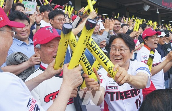 강기정 광주광역시장이 26일 오후 북구 광주기아챔피언스필드에서 열린 KIA 타이거즈와 두산 베어스의 경기를 시청 공직자들과 함께 관전하며 열띤 응원을 하고 있다.