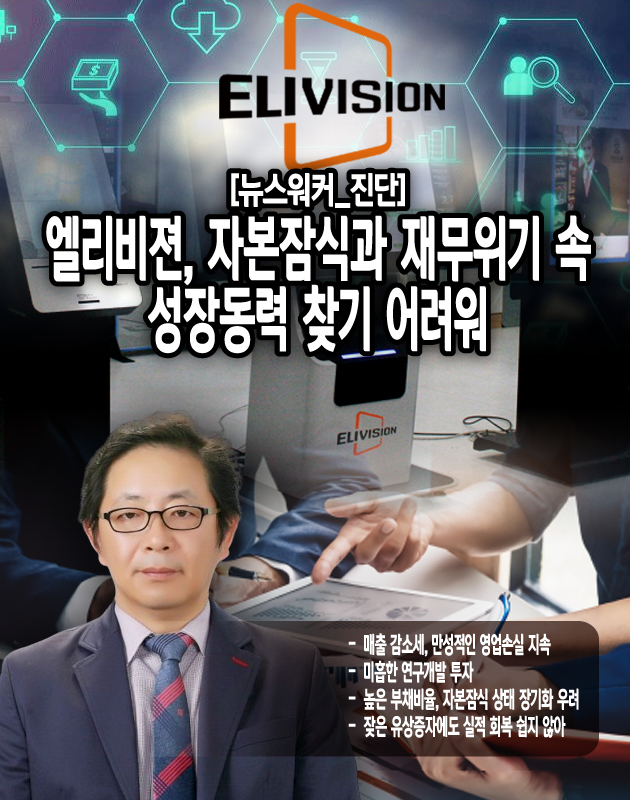 엘리비젼이 위기다. 주력 사업의 성장 정체와 수익성 악화가 고착화 양상을 보이고 있다. 방만한 차입경영의 후유증으로 부채비율이 높고 자본잠식마저 장기화되고 있어 재무구조도 취약하기 그지없다. 성장 활로를 뚫기 위한 신사업 육성에도 고삐를 죄어야 할 처지다. 엘리비젼이 성장통을 딛고 재도약하기 위해서는 선택과 집중이 필요해 보인다. 유망한 신사업에 경영자원을 집중 투입하고, 수익성 없는 사업은 과감히 정리하는 게 바람직해 보인다. 이와 함께 비용 효율화를 통한 체질개선, 유상증자 등을 통한 재무구조 개선에도 힘써야 할 것이다. 엘리비젼이 위기를 기회로 만들 수 있을지 귀추가 주목된다.