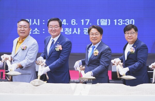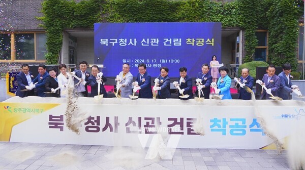 강기정 광주광역시장이 17일 오후 북구청 광장에서 열린 ‘북구청사 신관 건립 착공식’에 참석해 문인 북구청장 등 내빈들과 시삽을 하고 있다.