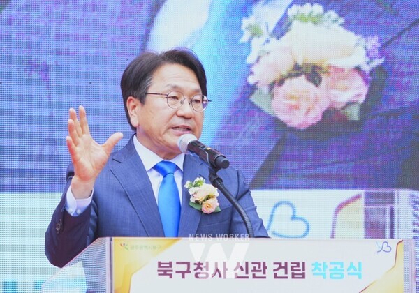 강기정 광주광역시장이 17일 오후 북구청 광장에서 열린 ‘북구청사 신관 건립 착공식’에 참석해 축사를 하고 있다.