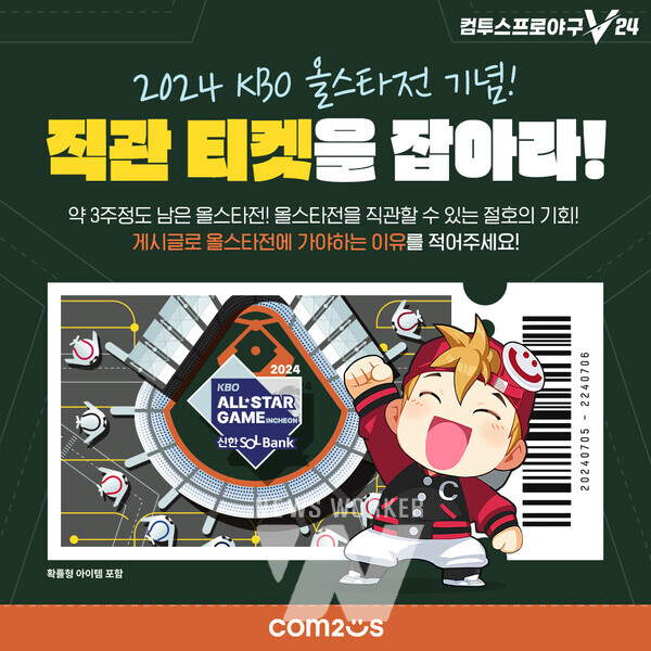 이번 이벤트는 ‘컴프야V24’ 공식 커뮤니티 이벤트 참여 게시판에 ‘KBO 올스타전’에 가야 하는 사연을 등록하면 참여할 수 있으며, 당첨자에게는 7월 5일 열리는 ‘올스타전 프라이데이’와 6일 열리는 ‘올스타전’ 테이블석 또는 내야 지정석 티켓이 지급된다. 드림과 나눔, 두 팀으로 나뉘어 펼쳐지는 ‘KBO 올스타전’의 승리 팀을 예측하는 이벤트도 열린다. 공식 커뮤니티를 통해 투표를 진행하고, 예측에 성공한 유저들 중 250명에게 추첨을 통해 TVING 구독권을 지급할 예정이다.