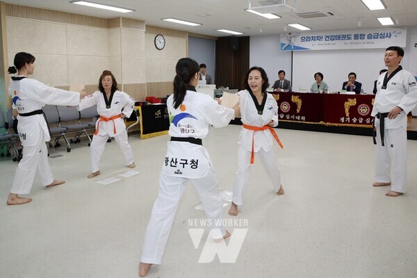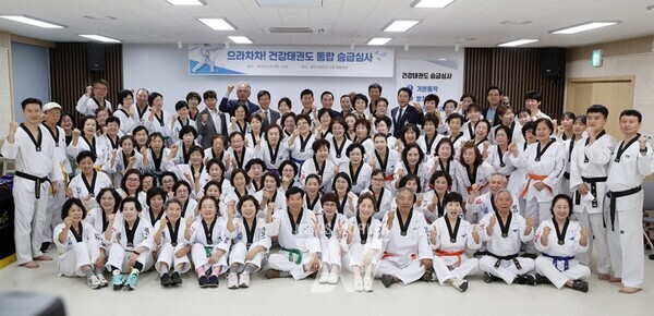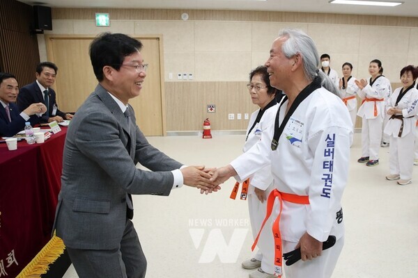 박병규 광산구청장이 20일 광산구보건소에서 진행된 ‘으라차차 건강 태권도’ 통합 승급심사 현장을 찾아 전원 승급에 성공한 참여 어르신들과 기쁨을 나눴다.