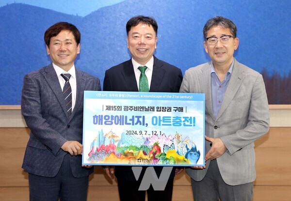이상갑 광주광역시문화경제부시장이 24일 오후 시청 3층 집무실에서 비엔날레 입장권 구매증서를 정회 ㈜해양에너지대표이사로부터 전달받고 기념촬영을 하고 있다. 사진 왼쪽부터 이상갑 문화경제부시장, 정회 ㈜해양에너지대표이사, 박양우 광주비엔날레 대표이사. / 광주광역시 제공