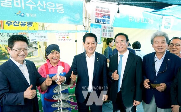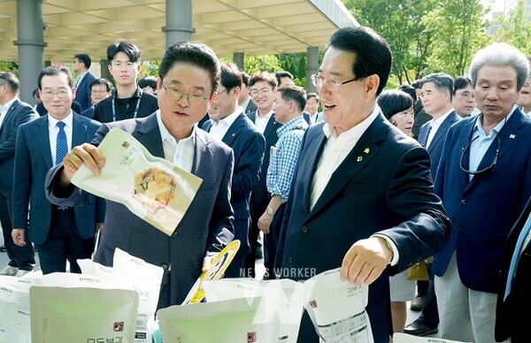 김영록 전라남도지사와 이철우 경상북도 도지사가 24일 오후 “영호남의 힘으로, 모두 함께 대한민국”이라는 슬로건 아래 서울 광화문 광장에서 개최된 ‘영호남 상생협력 화합대축전’ 新화개장터 특산품 코너인 영광보리굴비 부스를 둘러보고 있다.