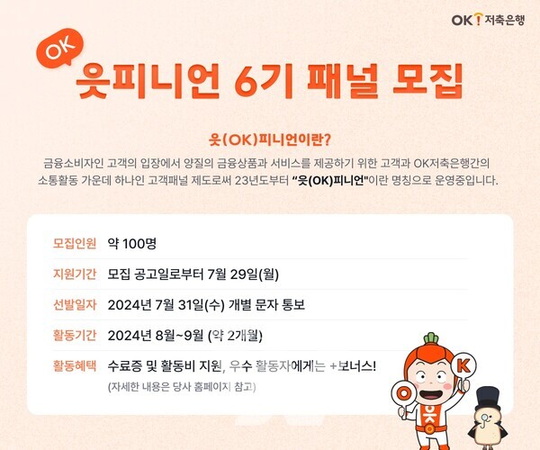 OK저축은행(대표 정길호)은 현장의 생생한 목소리를 전달할 ‘제6기 읏(OK)피니언’ 모집을 시작한다고 17일 밝혔다. 읏(OK)피니언은 OK저축은행의 ‘OK’와 의견(Opinion)을 합성한 단어로, 금융소비자 관점에서 OK저축은행이 제공하는 각종 서비스와 금융상품에 대한 의견과 불편사항을 발굴하고 개선방안을 모색해 제안하는 고객패널제도다.