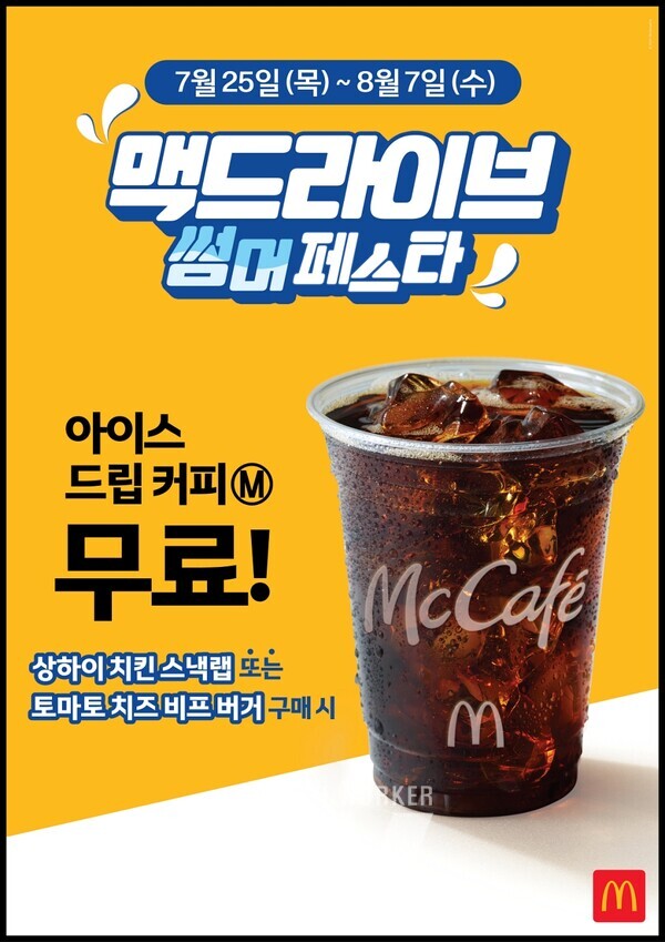 맥도날드는 ‘맥드라이브 썸머 페스타’ 프로모션을 통해 행사 기간 동안 ‘맥드라이브’로 ▲상하이 치킨 스낵랩 ▲토마토 치즈 비프 버거 2종 중 하나를 구매할 경우 ▲아이스 드립 커피(M)를 무료로 제공한다. 이번 프로모션은 오는 8월 7일까지 약 2주간 오전 10시 30분부터 오전 4시까지 진행되며, 무료로 제공되는 아이스 드립 커피(M)는 따뜻한 드립 커피(M)로 교환 가능하다.