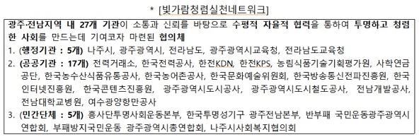 2024년 빛가람청렴실천네트워크의 회장기관으로 선정된 전력거래소는 정동희 이사장의 적극적인 지원과 부회장 기관인 나주시 및 총무기관인 한국방송통신전파진흥원과 협력으로 광주․전남지역의 청렴 문화 확산을 위해 노력하고 있으며, 전력거래소 감사실은 앞으로도 청렴시민감사관들의 소통과 협력의 장을 계속 마련해 나갈 예정이라고 밝혔다.