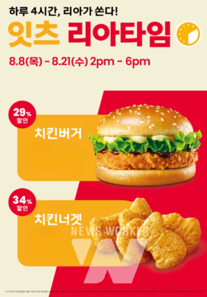 ‘리아타임’은 롯데리아가 특정 시간에 대표 인기 메뉴를 매장에서 할인된 가격으로 제공하는 행사로, 행사 품목은 ‘치킨버거', ‘치킨너겟’ 2종이다. 치킨버거는 기존 판매가 4,100원에서 29% 할인된 가격에 판매하며, 치킨너겟은 기존 판매가 2,900원에서 34% 할인된 가격에 판매한다. 이 밖에 리아타임 메뉴 구매 고객 대상 선착순 50명에게 귀여운 햄버거 모양의 ‘롯데리아 촵딱이’ 키링도 무료로 증정한다.
