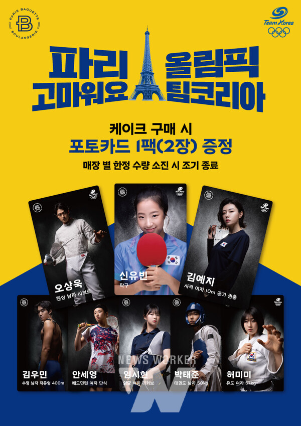 파리바게뜨가 ‘2024 파리올림픽’의 국가대표 선수단 ‘팀코리아(Team Korea)’ 포토카드를 자체 제작해 증정하는 이벤트를 진행한다고 14일 밝혔다. 이번 이벤트는 ‘2024 파리올림픽’에서 전 국민에게 잊지 못할 기쁨과 감동을 안겨준 팀코리아 선수들이 보여준 뜨거운 열정과 노고를 기념하고자 기획됐다.