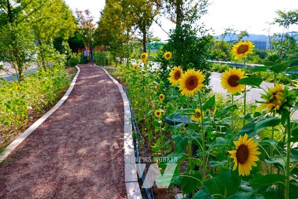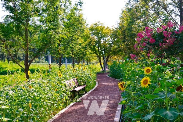 전남 보성읍 우산교차로에서 장거리교차로까지 2.1km의 미세먼지 숲길에 배롱나무, 해바라기가 활짝 펴 길을 걷는 사람들에게 힐링과 건강을 함께 선사하고 있다.