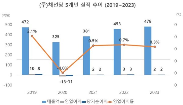 최근 5개년 재무제표에 따르면 채선당의 매출액은 2019년 472억, 2020년 325억, 2021년 381억, 2022년 453억, 2023년 478억으로 코로나-19 위기가 발발한 2019년 이래 2020년에 매출액이 31.2% 급감하였다가 이후 다시 회복하는 추이이다. 감사보고서에 매출 세부 구성이 주석에 제시되어 있지 않아 정확히 파악하기는 어렵지만, 2019년 대비 2023년에 상품 매출이 232억에서 332억으로 증가한 반면, 제품 매출은 141억에서 118억으로 감소, 기타 매출 또한 100억에서 29억으로 감소한 것을 볼 때, 가맹점을 통한 매출은 지속적으로 감소한 반면 밀키트 또는 도시락 종류의 상품을 통해 매출액 규모를 유지한 것으로 추측된다.