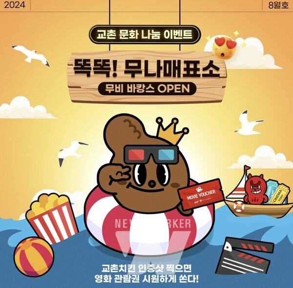 8월 ‘교촌무나매표소’ 이벤트는 교촌과 함께하는 무비 바캉스 컨셉으로 진행된다. 오는 8월 25일(일)까지 ‘교촌옥수수’ 단품 메뉴(▲교촌옥수수통안심 ▲교촌옥수수오리지날 ▲교촌옥수수순살) 인증샷을 촬영한 후 필수 해시태그와 함께 영화를 같이 보고 싶은 친구를 태그해서 개인 인스타그램에 업로드하면, 추첨을 통해 총 10명에게 무료 영화 관람권(1인 2매)을 증정한다. 당첨자는 8월 27일(화) 개별 안내될 예정이다.