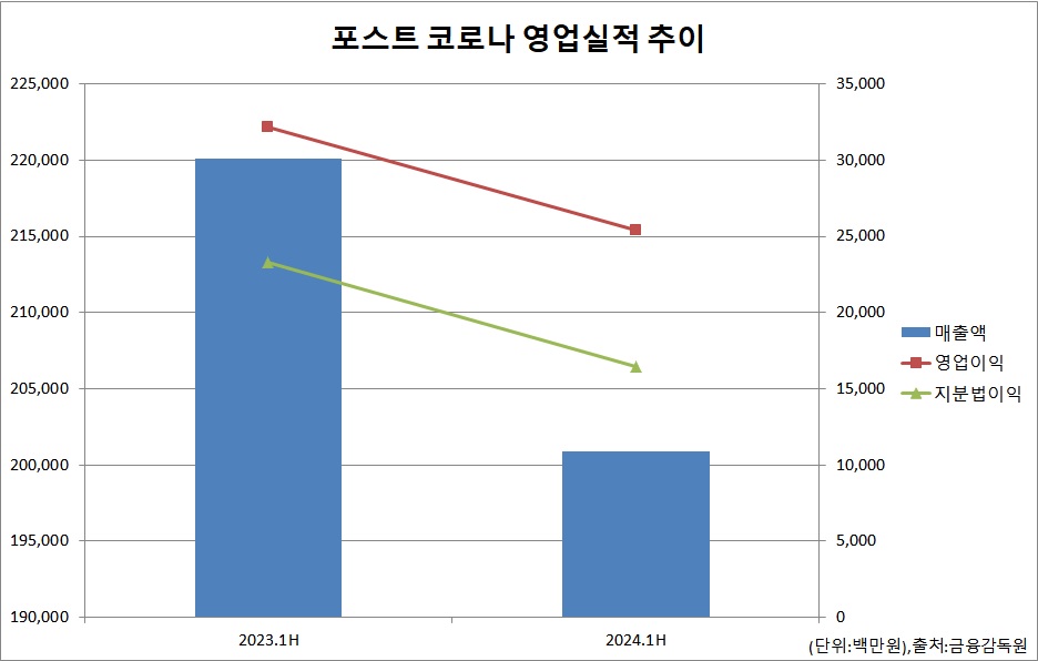 골프존뉴딘홀딩스의 2024년 상반기 매출액은 2,008억 원으로, 이는 2023년 상반기의 2,200억 원에 비해 약 200억 원 감소하였다. 영업이익은 254억 원으로, 2023년 상반기의 322억 원에 비해 약 68억 원 감소하였다. 별도 기준으로 영업수익은 약 66억 감소하였는데 브랜드로열티와 기타 수익은 2억 원 이상 증가한 반면 지분법 이익의 감소액이 약 68억 원을 기록하여 계열사들의 영업실적이 악화되었음을 알 수 있다.