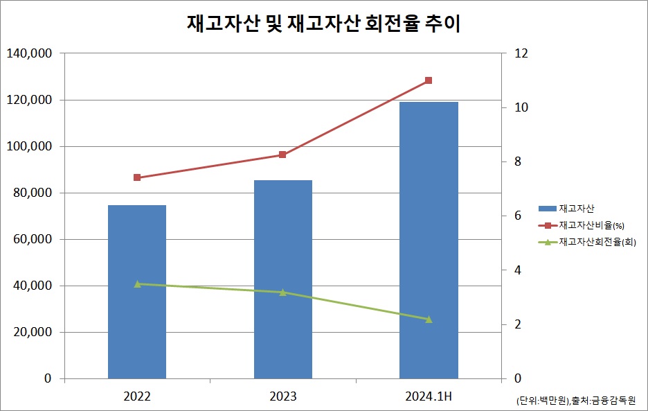 자회사들의 매출액 감소를 맞이한 가운데 골프존뉴딘홀딩스의 유동부채는 23년 약 1,530억 원에서 2,067억 원으로 537억 원 증가하며 유동비율은 94.4%에서 92.2%로 소폭 하락했다. 총부채는 약 360억 원 증가한 3,606억 원을 기록하였다. 재고자산은 23년 기말 855억 원에서 1,191억 원으로 336억 원 가량 증가하여 총자산대비 재고자산의 비율은 3년 연속 증가세에 있다. 재고자산 회전율 또한 3.2회에서 2.2회로 낮아졌고 그 변동폭은 작년에 비해 커졌다.